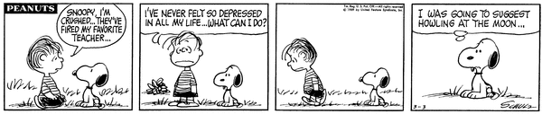 Dans un cartoon du genre, Sally et Charlie sont de dos pendant 8 cases dans à peu près la même position parlant du ciel. Le ciel est noir. Le rien les entoure. Le noir les enveloppe. Rien ne se passe vraiment. Il n'y a pas d'action. Sinon de la conversation. Même Gaston Lagaffe était plus actif. Mais le cartoon est extrêmement vivant. Par ses possibilités, ses interrogations, son humanité. Schulz faisait des merveilles avec du rien. Si Schulz y met trop de distractions visuelles, sonder les troubles intérieurs devenait assurément moins efficace.