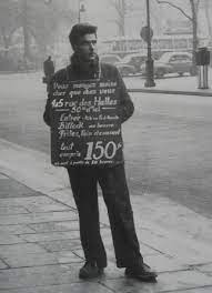 On voit bien qu'il n'a pas envie de s'expliquer et qu'il le fait parce que forcé par les pancartes de son rôle d'homme-sandwich.