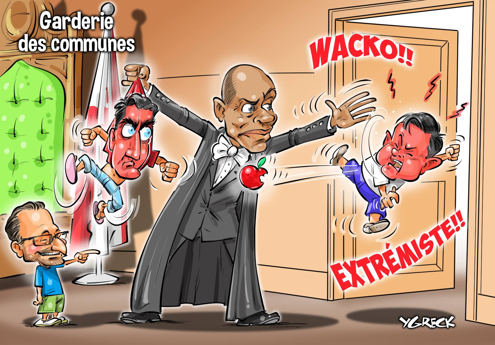 Ça ne s'invente pas, cette semaine, le même jour où Donald Trump se faisait donner 9000$ d'amendes en cour pour intimidation en direct de témoins et de jury, et menacé d'incarcération si il ne maturait pas un peu, Pierre Poilièvre se faisait expulser de la chambre pour avoir traité Justin Trudeau de cinglé. Et pour avoir changé le mot pour extrémiste radical, comme un enfant changerait le mot crétin par imbécile. Ce que le désinformateur* ne dit pas est que Justin pense décriminaliser certaines drogues à la suggestion de l'association Canadienne des Chefs de Police. Mais quand tu triches, tu ne dis pas tout.