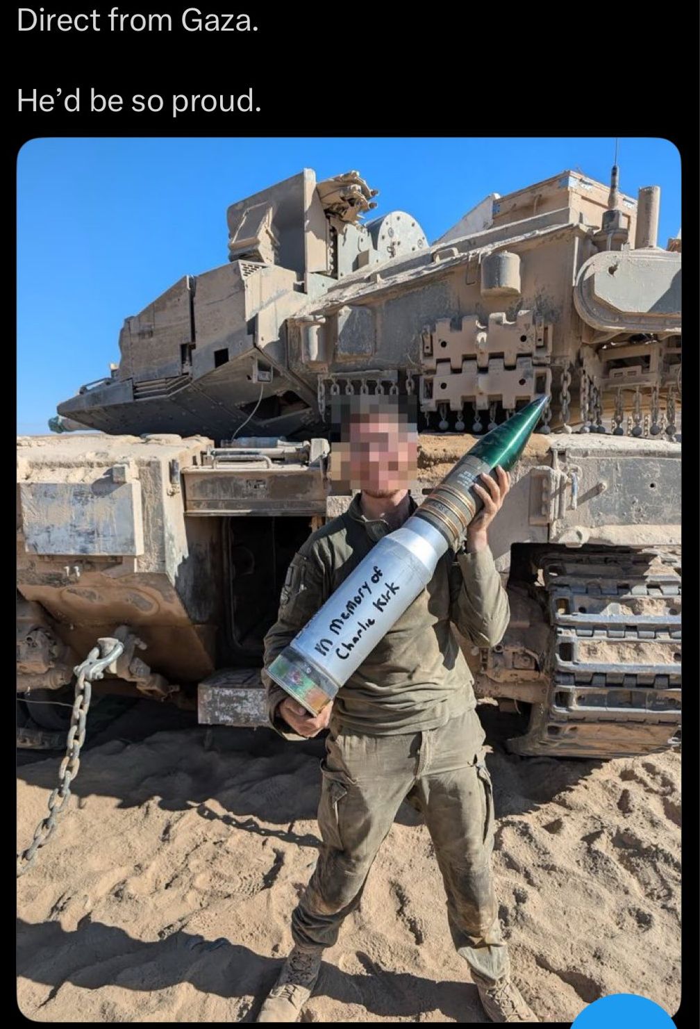 146 à 10. Et on continue le génocide jour après jour. J'ai vu une photo de soldat des États-Unis, Israélien, signant sur la bombe qu'il allait lancer aveuglément sur Gaza, "Pour Charlie Kirk".