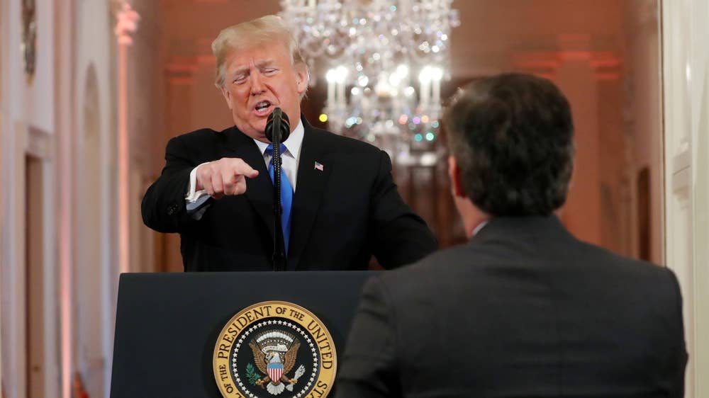 Le journaliste a précisé, quand Donald a dit qu'il ne démonisait personne et qu'il voulait que ces gens viennent au pays (mais légalement) que ces gens étaient pourtant tellement loin des États-Unis en ce moment. Ce à quoi Trump a parlé par dessus en disant "Laissez moi mener mon pays, vous vous occuper de CNN et si vous le faisiez mieux, vous auriez de bien meilleures cotes d'écoute." Il a mentalement changé d'interlocuteur et a joint la pensée au geste en dirigeant son attention ailleurs. Acosta a insisté pour lui poser une autre question, ce à quoi Adolf Trump a dit que c'était assez.