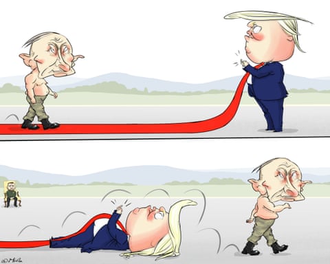 Le président des États-Unis ne peut pas parler de succès pour vendredi. Il adore pouvoir en parler tout de suite après et là, il a refusé de prendre des questions. Il avait échoué partout. Il a même annulé le repas prévu, il était probablement en beau fusil. 0 en 3 pour le "grand négociateur". Il voulait un cessez-le-feu. Het!*, il voulait avoir la chance de donner au président Russe une relâche des sanctions de la part des autres pays contre les Russes (les États-Unis n'en font pas) et il voulait faire un "deal" d'affaires Het! et finalement, il voulait une renégociaton du traité nucléaire, dans le but de gagner le Prix Nobel. Het! 0 en 3.*Non